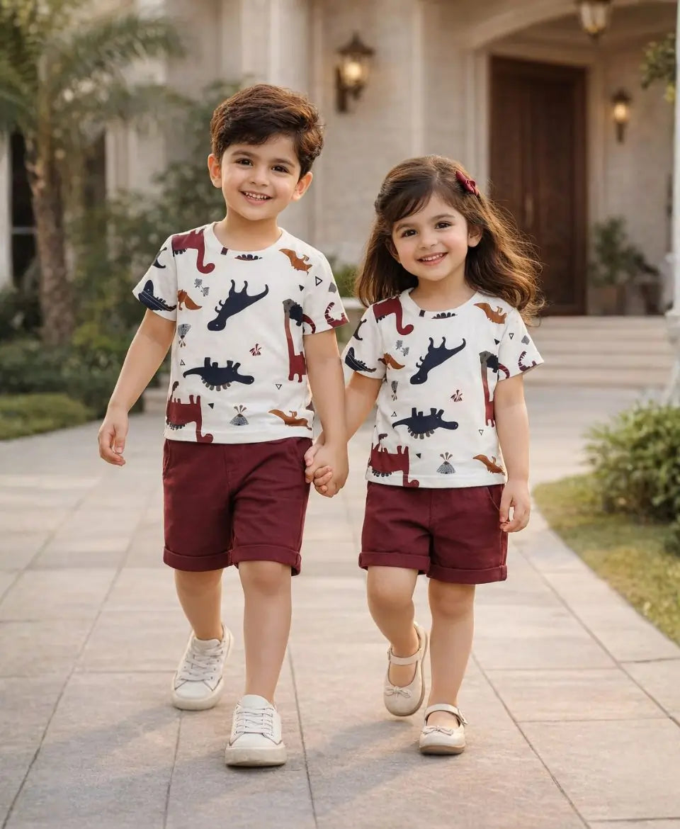 The Dino Adventure Suit Set is a fun 2-piece unisex summer outfit featuring a soft breathable jersey T-shirt with playful dinosaur prints and a matching solid maroon elastic waist nicker. Made with the same GSM as our summer T-shirts, this lightweight and summer-friendly set keeps kids cool while ensuring all-day comfort.