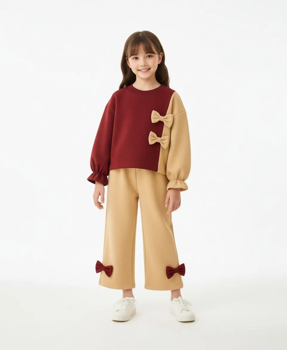 Give your little princess the perfect blend of warmth and charm. Our Girls Fleece Sweatshirt & Pants Set features a beautiful maroon and beige color combo with adorable bow details — ideal for girls who love to look pretty while staying warm and comfortable all winter long.