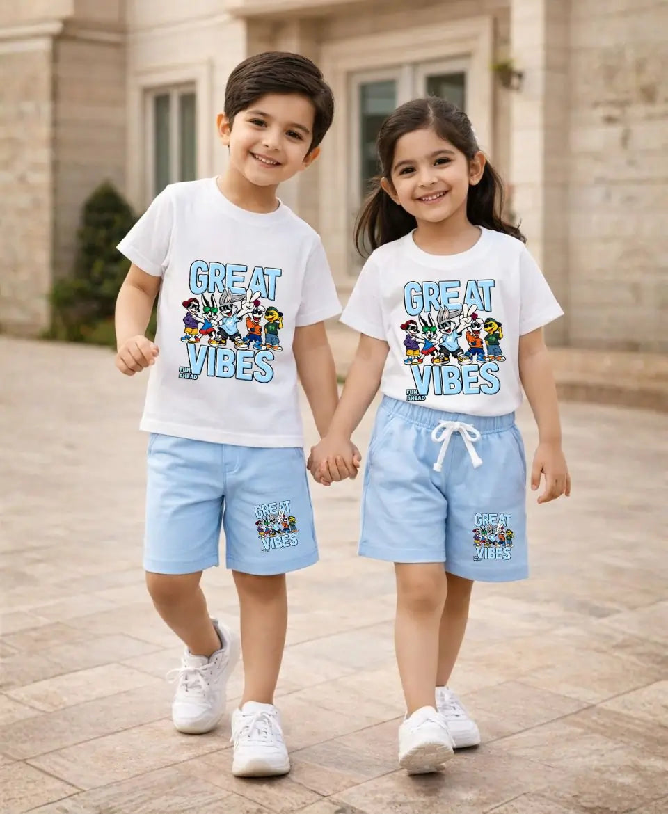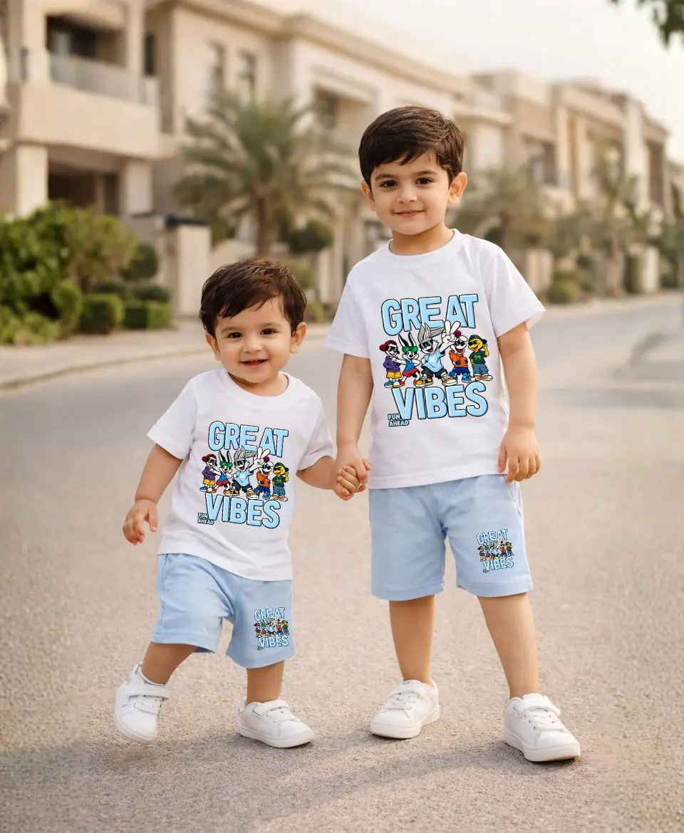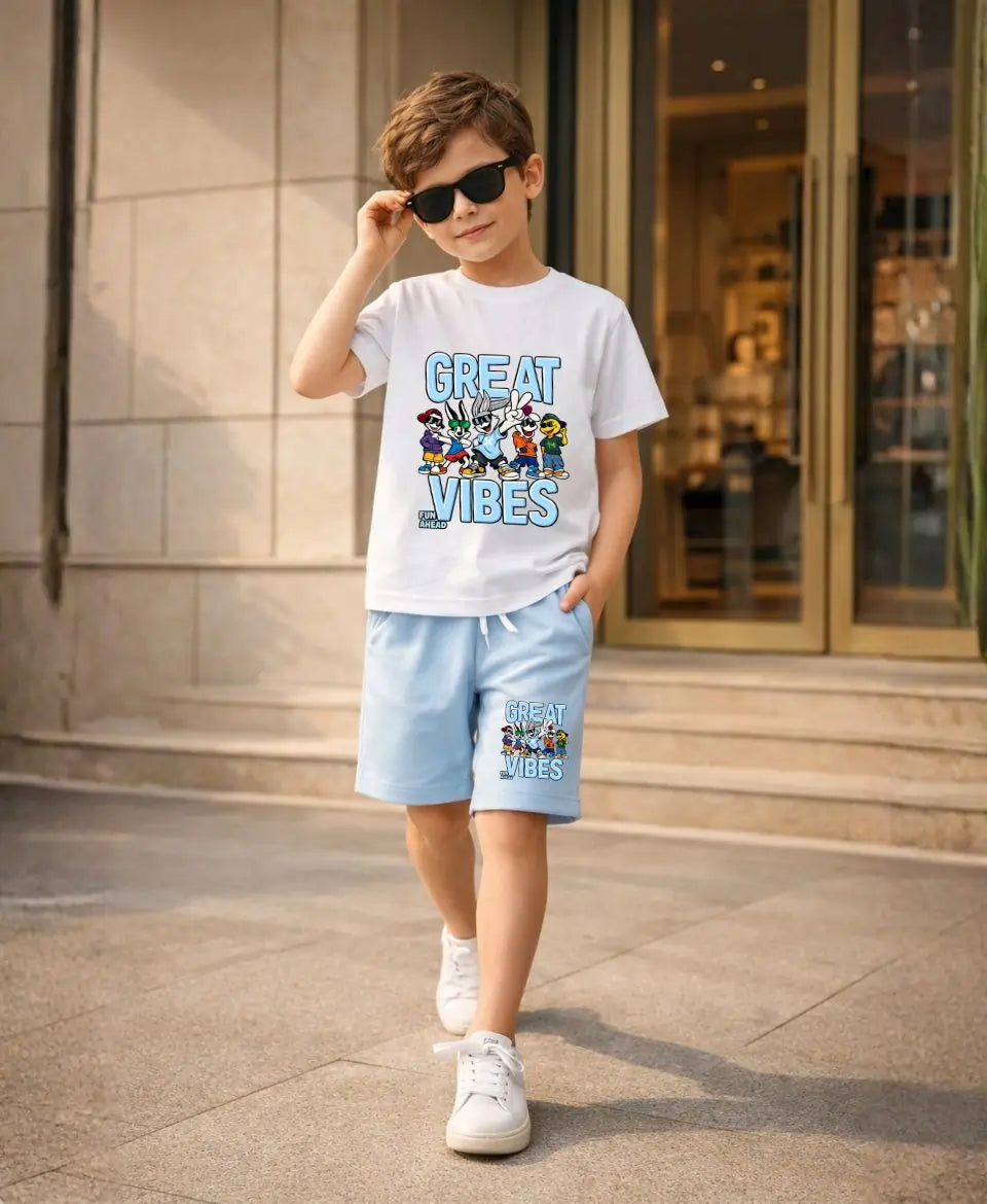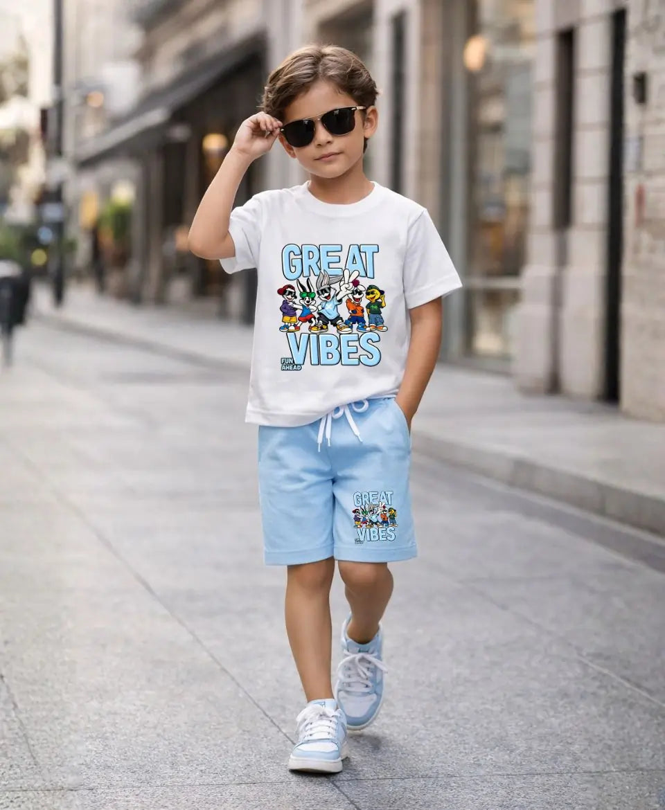 The Great Vibes Graphic Suit Set is a fun 2-piece unisex summer outfit featuring a soft breathable jersey T-shirt with a bold "Great Vibes" cartoon graphic print, paired with a matching elastic waist nicker with coordinated print detail. Made with the same GSM as our summer T-shirts, this lightweight and summer-friendly set keeps kids cool and comfortable all day.