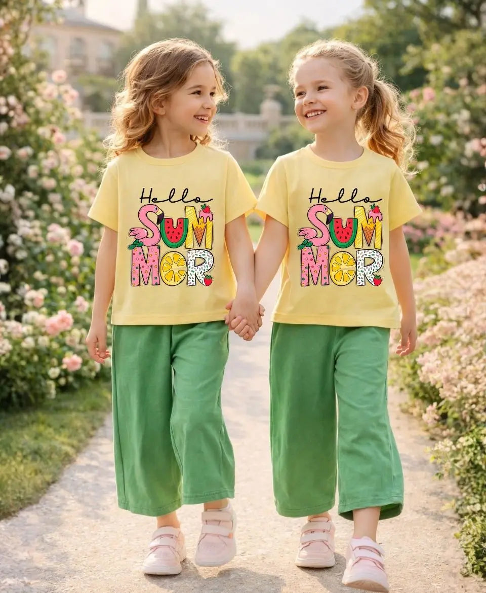 This girls summer suit set includes a colorful printed T-shirt paired with a comfortable trouser bottom designed for warm weather. Made from premium soft jersey fabric with the same GSM as our summer T-shirts, the outfit feels lightweight, breathable, and gentle on kids' skin. The elastic waistband trouser provides a flexible and relaxed fit, allowing kids to move easily during daily activities.
