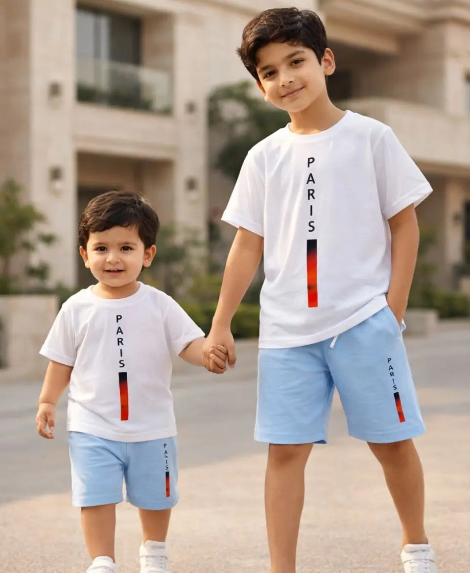 The Paris Gradient Summer Suit Set includes a stylish round-neck half-sleeve T-shirt paired with a comfortable matching nicker. Crafted from soft breathable jersey fabric with the same GSM as our summer T-shirts, this lightweight and summer-friendly outfit ensures all-day comfort. Available in multiple shirt colors, each paired with Grey, Camel, or Black nicker options.