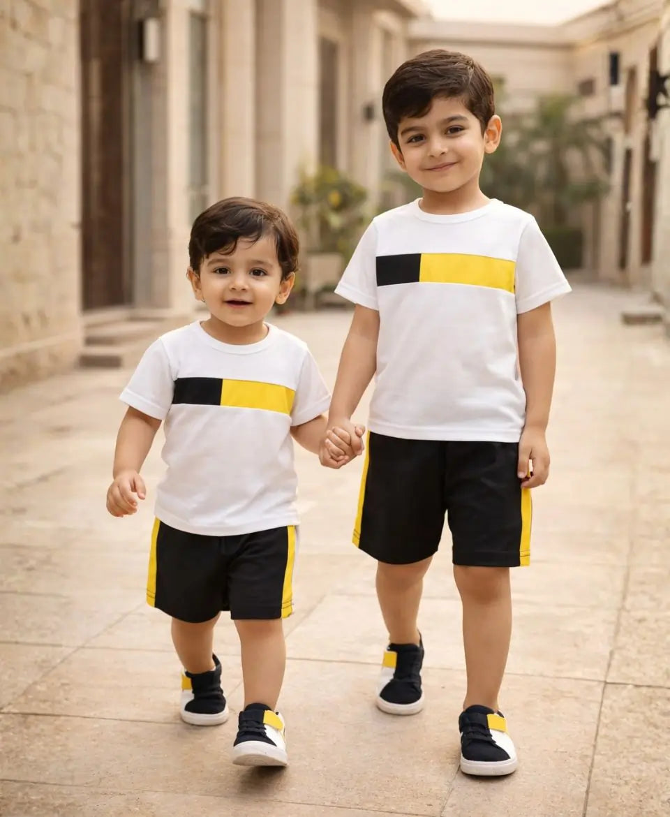 The Sport Stripe Contrast Suit Set is a stylish 2-piece unisex summer outfit featuring a soft breathable jersey T-shirt with bold horizontal black and yellow stripe detailing, paired with a matching elastic waist nicker with side stripe accents. Made with the same GSM as our summer T-shirts, this lightweight and summer-friendly set ensures all-day comfort for active kids.